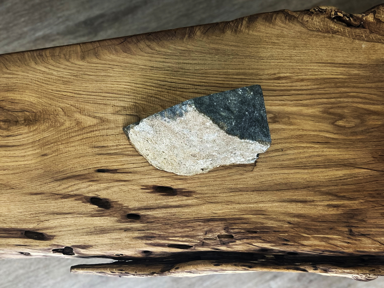 Il piano, sospeso tra due blocchi di pietra, è realizzato in legno di quercia antica. Questo tipo di legno è noto per la sua robustezza e la sua bellezza intrinseca. Nel caso di Vulcano, il legno di quercia antica è lasciato nella sua forma più naturale, con una minima lavorazione. Sono visibili i solchi naturali ed i fori creati in passato dai tarli del legno, accuratamente lavorati e protetti oggi questi solchi naturali conferiscono al tavolino un aspetto rustico, autentico, e unico.