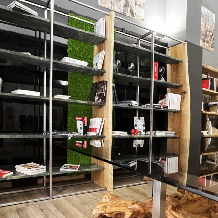 La struttura che regge la libreria è realizzata in acciaio inox, conferendo un aspetto fine e lineare. L'acciaio inox è scelto per la sua resistenza e durabilità nel tempo, assicurando che rimarrà solida e stabile nel corso degli anni. La struttura in acciaio unisce e sostiene tre maestose sezioni in legno. Le sezioni in legno di frassino sloveno è lavorato con maestria, evidenziando le sue venature e i nodi caratteristici.